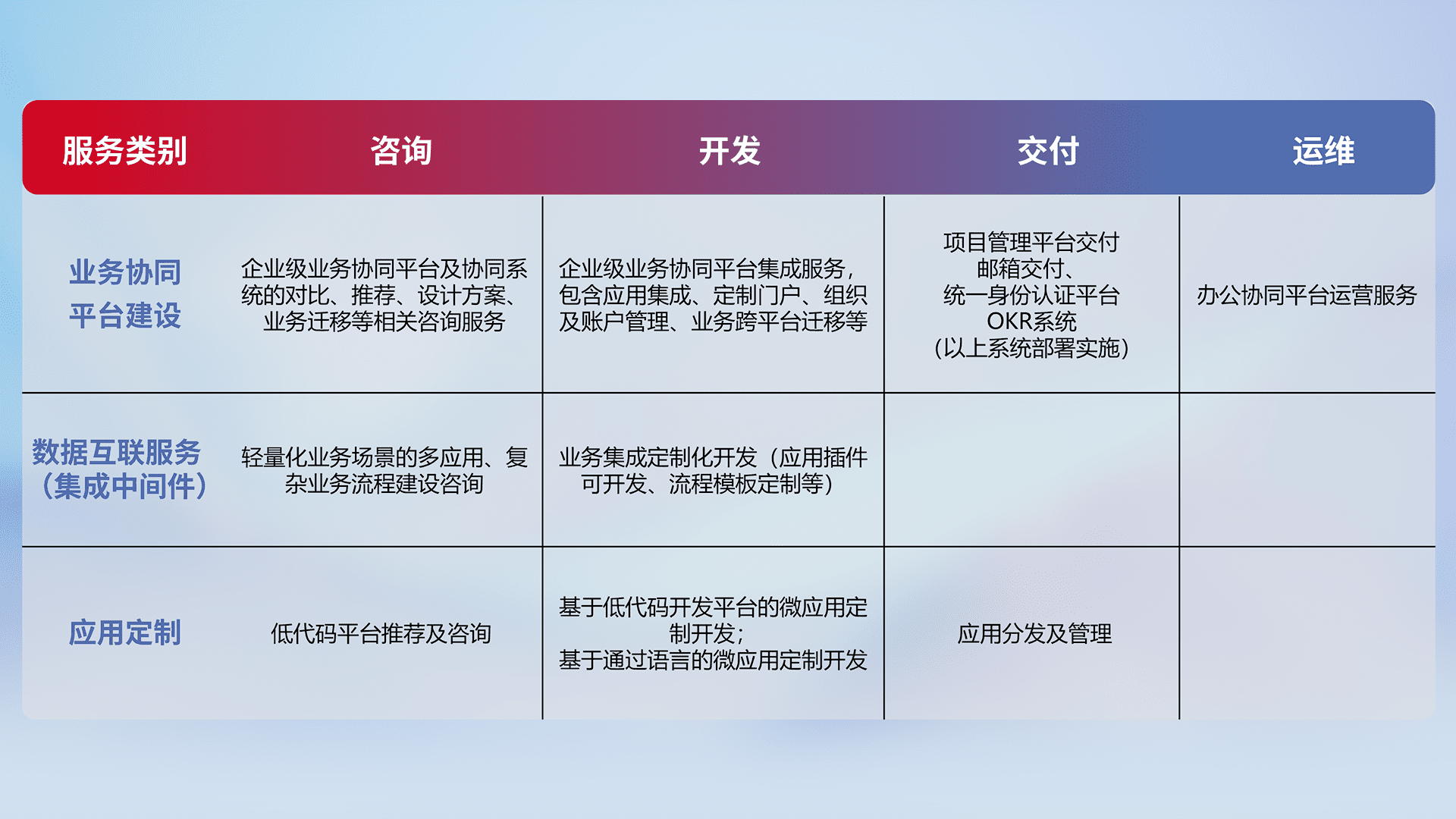 针对钉钉、、企微、、、IDaas等平台级产品提供产品的规划、、、、方案、、、、交付、、、、定制化开发等服务,,,实现如统一协同办公、、、智能客户服务、、、、混合会议管理、、、、智能数据查询、、等业务场景,,,实现数字化转型。。